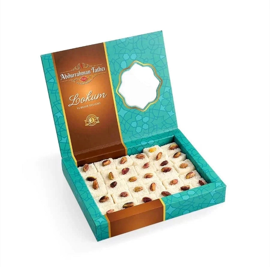 Otantik Türk tatlısının en zarif hali: Sultan Antep Fıstıklı & Hindistan Cevizli Lokum 550 g, özel anlardan lezzetli molalara kadar her zeminde parlayan bir seçim. İçinde bolca işlenmiş Antep fıstığı ve hindistan ceviziyle harmanlanmış bu lokum, geleneksel kalite ile modern hediye anlayışını birleştiriyor. Bol+2Turquaz Gourmet L.L.C+2