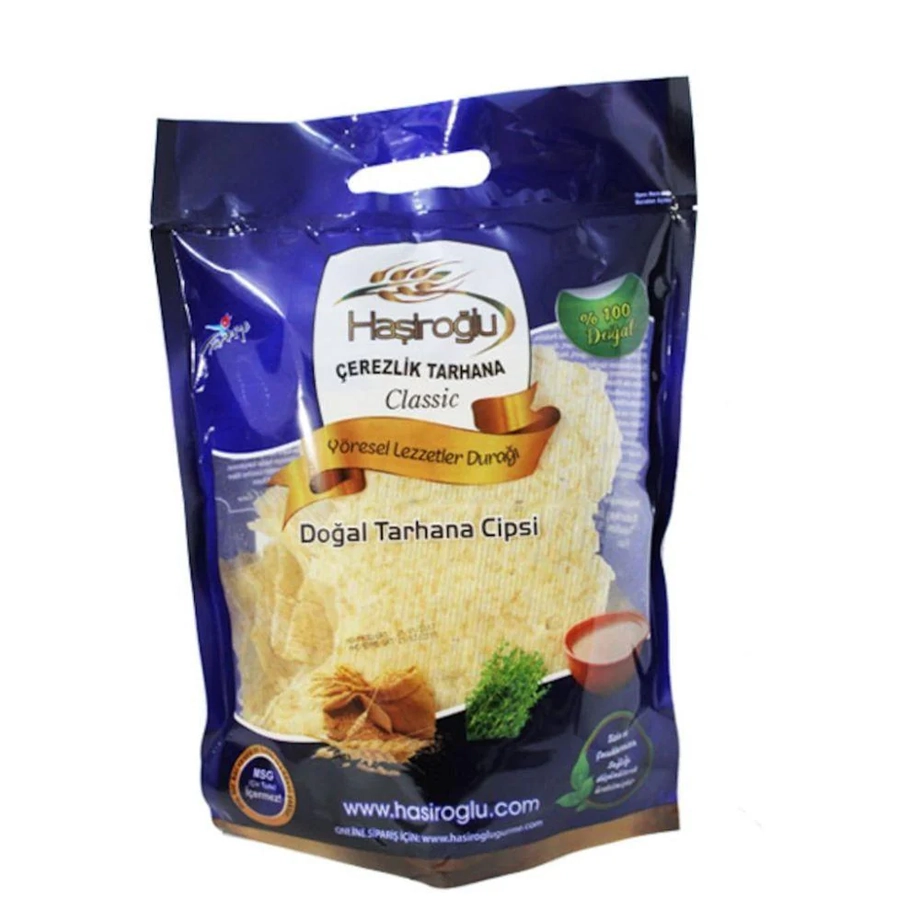 Maraş Fırınlanmış Bol Yoğurtlu Tarhana Cipsi, Türk mutfak kültürünün en köklü lezzetlerinden biri olan tarhananın modern bir yorumu olan bir aperatif ürünüdür. Bu ürün, Haşiroğlu tarafından özel olarak üretilmektedir. Ürün 450 gramlık bir pakette sunulmaktadır ve büyük boyutu nedeniyle uzun süreli tüketim için idealdir.Bu Maraş Tarhanası, en kaliteli buğday unundan ve günlük yoğurttan elde edilen tarhanaların özel olarak fırınlanmasıyla elde edilir. Bu sürecin bir parçası olarak, üründe yoğurt tadı ön plana çıkarılır ve bu da ürüne benzersiz bir tat katmaktadır. Ayrıca, fırınlanma işlemi sırasında ürün kızartılmadığı için daha hafif ve daha az yağlıdır. Bu nedenle, sağlık bilincine sahip tüketiciler için ideal bir seçim olabilir.Ürünün en önemli özelliği, büyüleyici ve otantik tarhana lezzetinin her bir cipsin içine işlenmiş olmasıdır. Bu, yoğun bir tarhana tadının unutulmaz bir ağız deneyimi yaratmasını sağlar. Tarhana, yoğurt ve unun belirli bir süre fermente edildikten sonra konserve edilip kurutulmasıyla elde edilen, Türk mutfak tarihinde onlarca yıllık bir geçmişi olan ayrı bir lezzettir.Ayrıca, Maraş Fırınlanmış Bol Yoğurtlu Tarhana Cipsi, fabrika ambalajında satılmaktadır, bu da ürünün tazeliğini ve kalitesini korur. Ürünün 450glık boyutu, büyük aileler veya uzun süreli tüketim için idealdir.Bu ürünün bir başka önemli özelliği de oldukça çok yönlü olmasıdır. Sadece aperatif olarak değil, yoğun tarhana lezzeti nedeniyle çeşitli yemeklerde veya sos olarak da kullanılabilir.Sonuç olarak, Maraş Fırınlanmış Bol Yoğurtlu Tarhana Cipsi, tarhananın benzersiz lezzetini modern bir sunumda arayanlar için ideal bir seçenektir. Her bir cips, kaliteli malzemeler ve özel pişirme teknikleri kullanılarak bir lezzet şölenine dönüştürülür, böylece tüketicilere unutulmaz bir ağız deneyimi sunar.